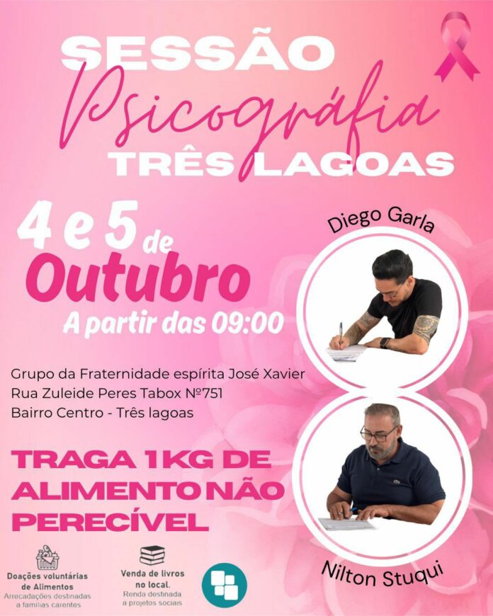 O Grupo da Fraternidade Espírita José Xavier de Três Lagoas realiza neste final de semana, dias 4 e 5 de Outubro, uma Sessão de Psicografia especial para a comunidade. O evento, que contará com os médiuns Diego Garla e Nilton Stuqui, tem como principal objetivo a arrecadação de alimentos para projetos sociais e famílias carentes.