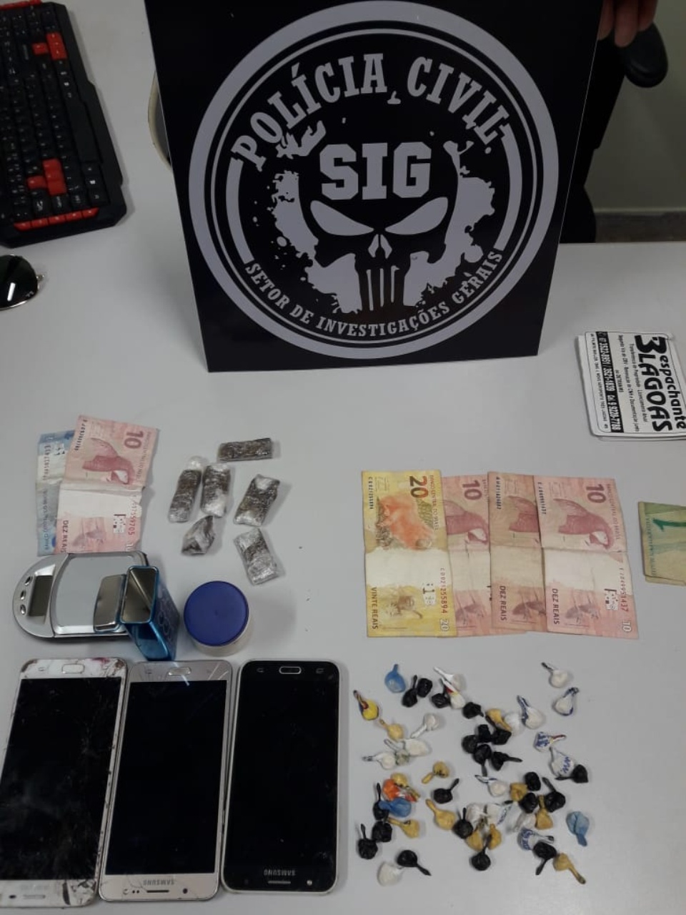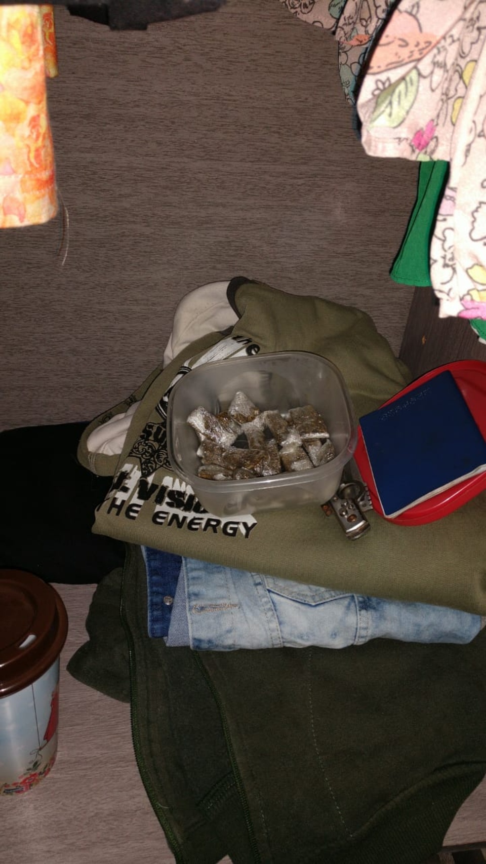Também foi detido ali no local, o indivíduo de nome L. R. C., 21 anos, sendo apreendido no bolso dele, cinco (05) papelotes de maconha, prontos para serem comercializados. No telhado da varanda dos fundos foi apreendido um maço de cigarro que continha em seu interior uma porção de maconha.