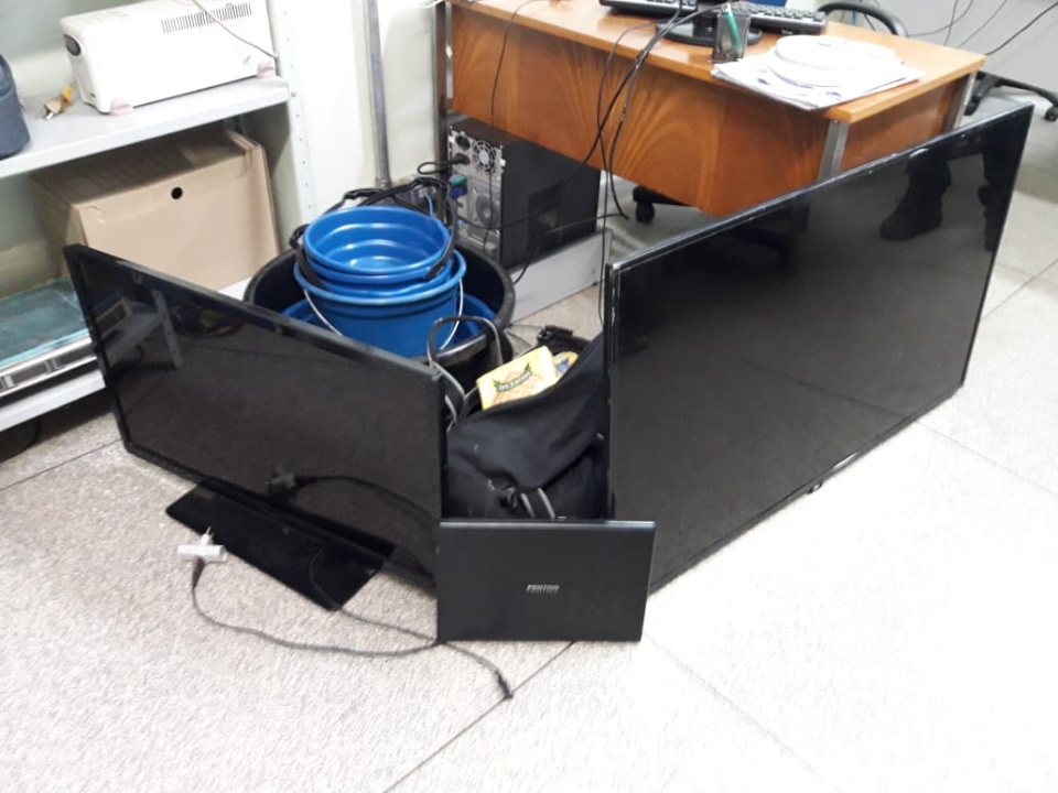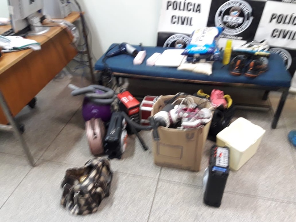 Foram apreendidos duas televisões, um notebook e outros objetos. A Polícia Civil tenta identificar quem são os proprietários dos itens encontrados.