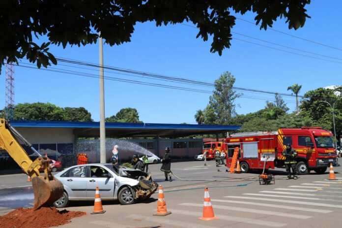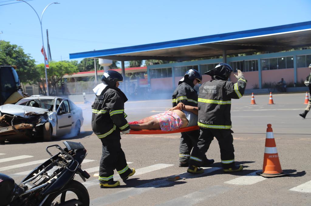 Membros do Corpo de Bombeiros de Três Lagoas foram peças fundamentais para dar um caráter mais real à simulação, empregando o salvamento e, ao mesmo tempo, agilizando a retirada das vítimas presas às ferragens do veículo acidentado.