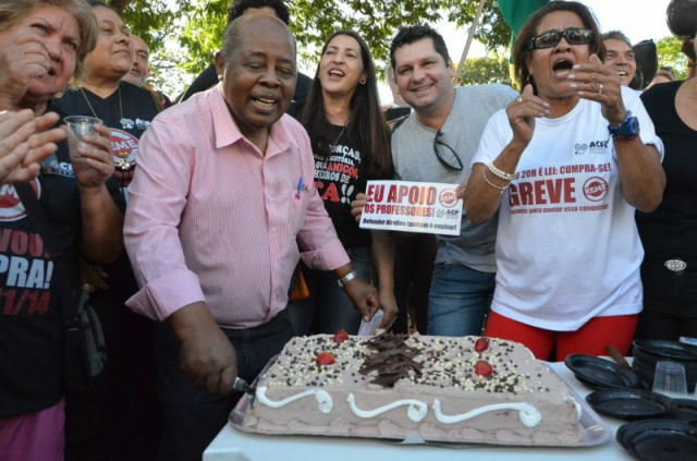 Para “comemorar” dois meses de greve, que compromete parcialmente o movimento de 35 das 94 escolas municipais, a ACP (Sindicato Campo-grandense dos Profissionais da Educação Pública) armou uma festa em frente à Prefeitura Municipal de Campo Grande. Os professores compraram dois bolos e adereços de festa para lembrar a dificuldade em fechar um acordo sobre o reajuste salarial, que seria de 13,01%.
