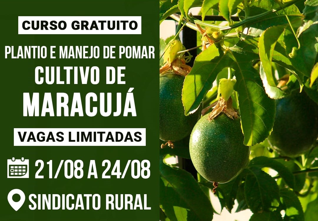 O Sindicato Rural de Três Lagoas (MS) promoverá um curso sobre o cultivo de maracujá. Estarão disponíveis 15 vagas para a atividade, que terá inscrições gratuitas. O curso acontecerá entre os dias 21 e 24 de agosto, das 7h às 11 e das 13h às 17h.