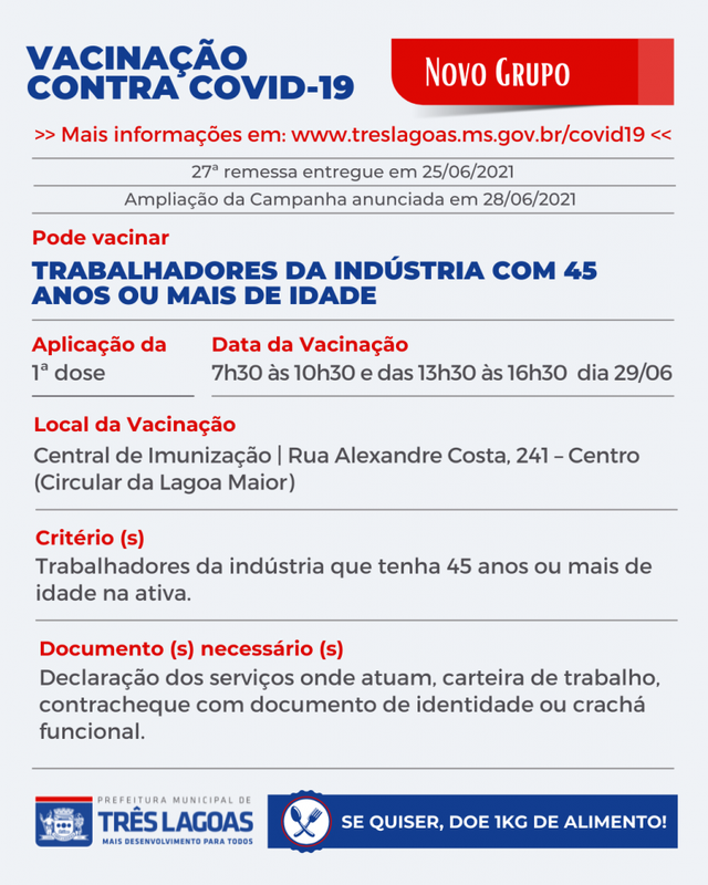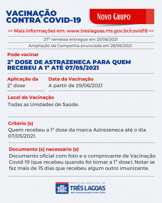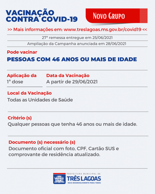 TRÊS LAGOAS (MS) Devido à baixa adesão dos grupos anunciados na última remessa de doses contra a Covid-19 envidas pelo Governo Federal, por meio do Governo do Estado de MS, a Secretaria Municipal de Saúde (SMS) decidiu avançar com a Campanha de Imunização contra o Novo Coronavírus e chamar novos grupos que poderão se imunizar a partir de amanhã (29).