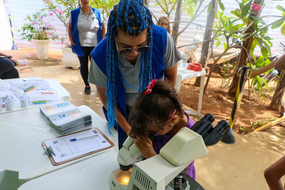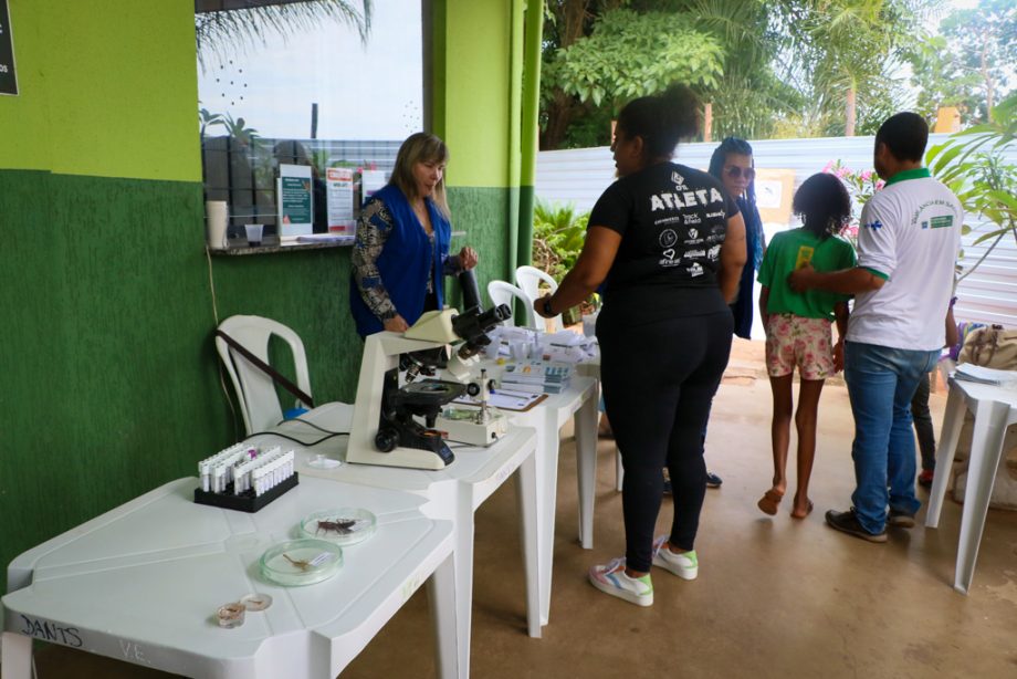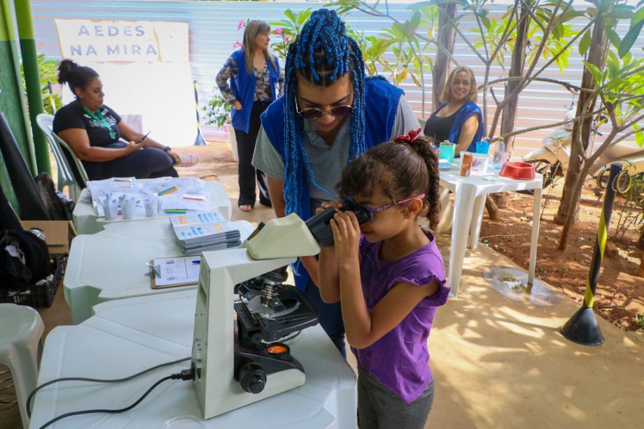 A ação trouxe exposição do ciclo biológico do Aedes aegypti, com tubos, contendo amostras das fases de vida do inseto, possibilitando conhecer as estruturas dos mosquitos, em lâminas expostas no microscópio e lupa óptica, trabalho de educação em saúde com orientação e entrega de material educativo, brincadeiras lúdicas com o tema combate ao aedes aegypti e premiação com medalha para as crianças.