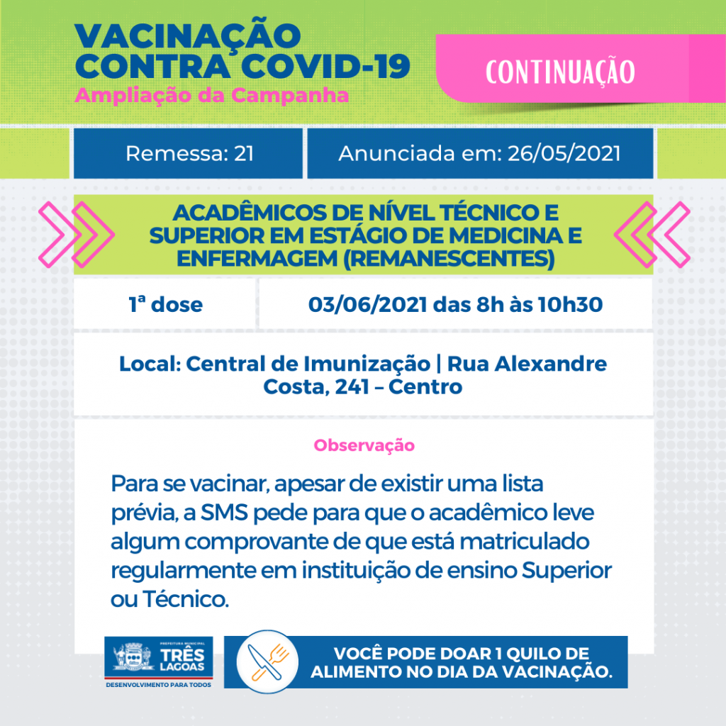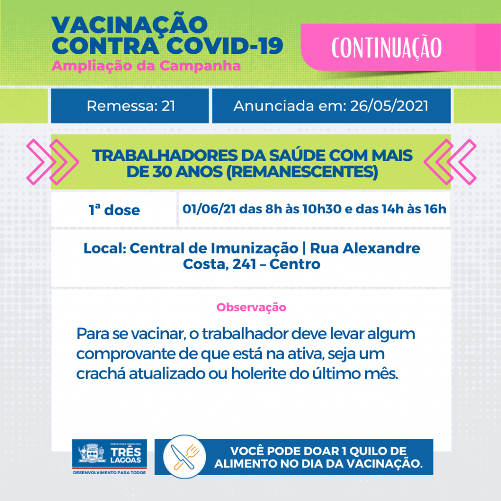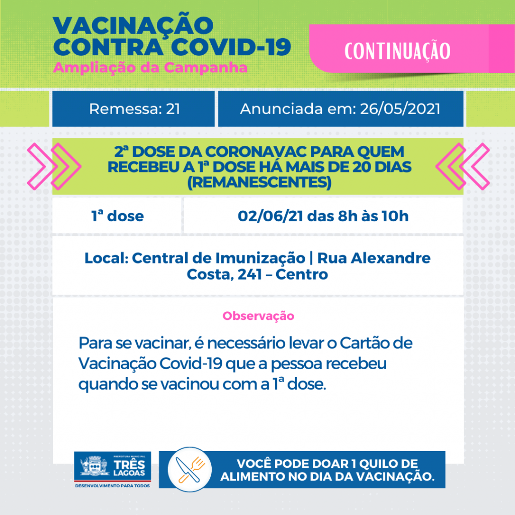 TRÊS LAGOAS (MS) – A Secretaria Municipal de Saúde (SMS) anuncia a continuação da vacinação contra a Covid-19 de três grupos remanescentes, ainda utilizando as doses da 21ª remessa enviada pelo Ministério da Saúde, por meio do Governo do Estado de Mato Grosso do Sul, na semana passada.