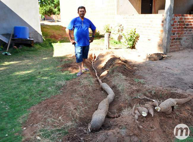 Famoso na cidade de Coxim, município a 253 quilômetros de Campo Grande, por ter encontrado há dois anos, uma mandioca de 2,35m, o serviço gerais Itamar Marçal de Oliveira, de 59 anos, colheu na manhã desta quinta-feira (19), uma mandioca que mede 4,65m de comprimento, na rua Frei Cirino João Primon, no bairro Senhor Divino.