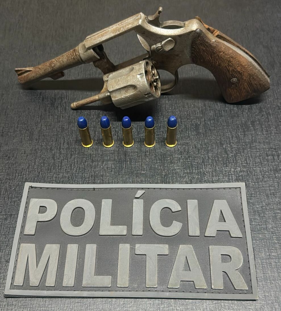 Durante a tentativa de fuga, os policiais observaram o momento em que o homem arremessou um objeto para dentro da casa. Ao verificarem o item, constataram tratar-se de um revólver calibre .38, municiado com cinco munições intactas.