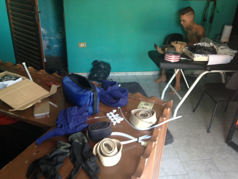Amarras, faixas de artes marciais e algemas, apetrechos muito utilizado por bandidos para imobilizar suas vítimas durante roubos, foram encontrados em um estúdio de tatuagem no bairro Lapa, durante operação dos agentes da 1ª Delegacia de Polícia Civil que investigavam um roubo ocorrido na casa de um médico no mês de fevereiro.