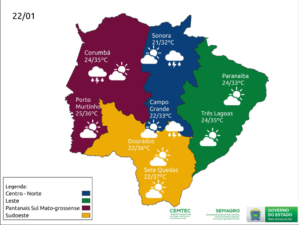 Confira no mapa as condições de tempo e temperatura estimados pelo Cemtec para Campo Grande e alguns municípios de Mato Grosso do Sul.