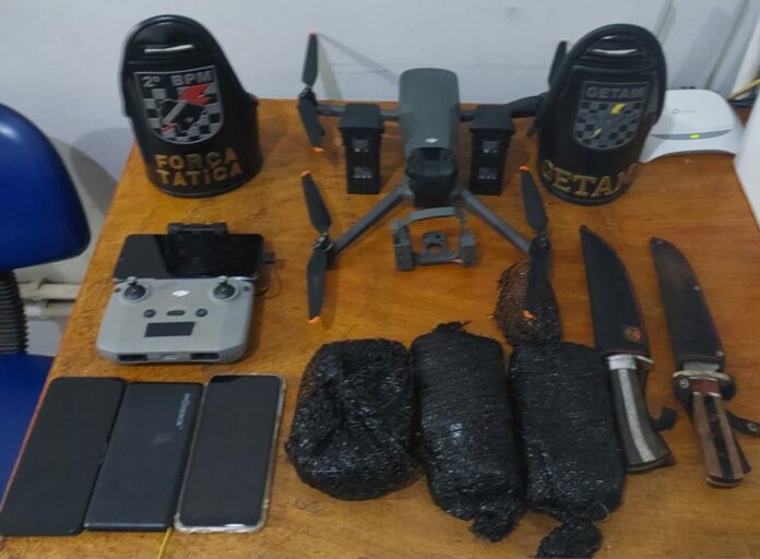 Com os criminosos foram encontrados dois revólveres, facas, um drone com duas baterias e três tabletes de maconha, além de um lançador de carga, usado para arremessar a droga.