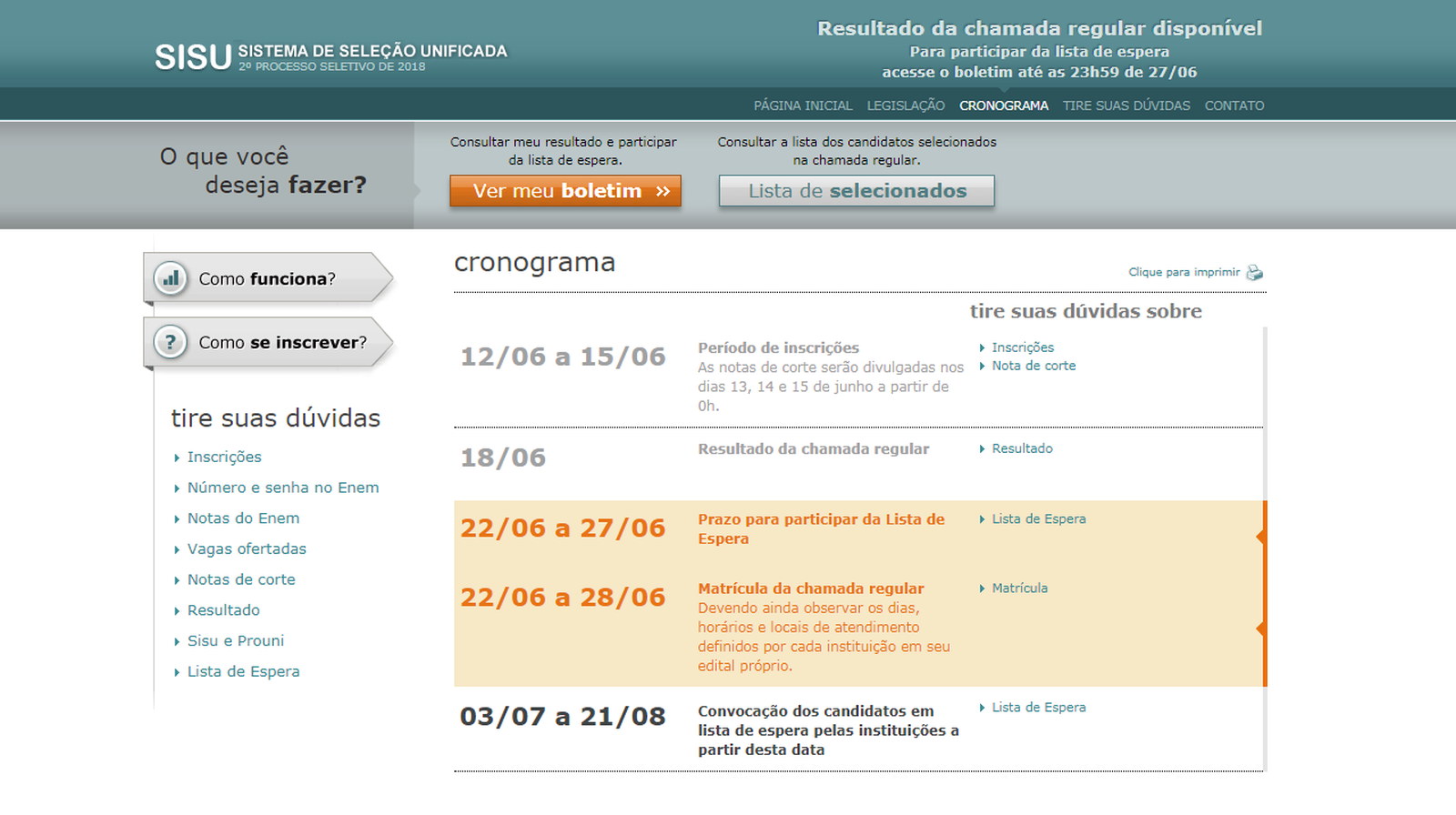 Terminou às 23h59 desta quarta (27) o prazo para os candidatos que não foram chamados se inscreverem na lista de espera. A convocação para vagas remanescentes será feita pelas próprias universidades entre 3 de julho e 21 de agosto.
