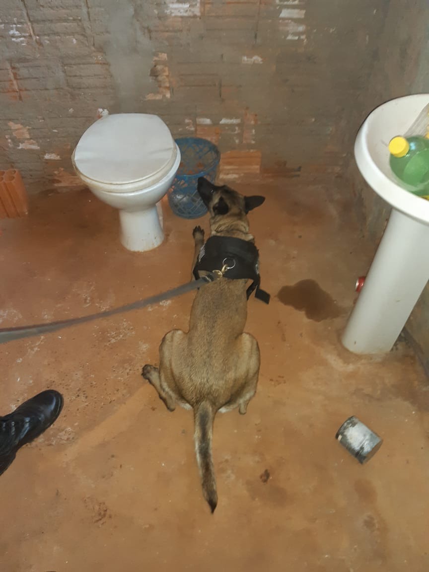 Após fazer uma varredura no imóvel suspeito, a cadela K9 farejou entorpecentes em um dos cômodos da casa.
