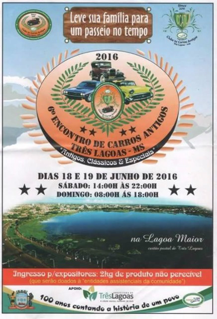 O 6º Encontro de Carros Antigos de Três Lagoas será realizado nos dias 18 e 19 de Junho na circular Lagoa Maior, localizada na Avenida Aldair Rosa de Oliveira, ao lado do ginásio poliesportivo.