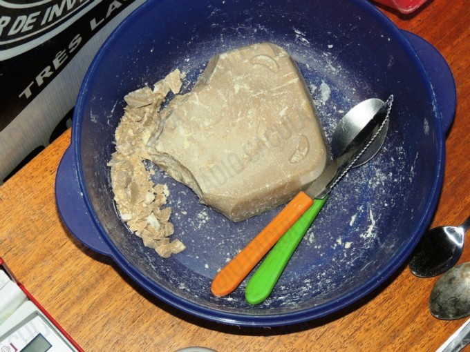 P.A.O.B. disse aos policias que a droga estava em sua residência, com isso a equipe se deslocou até o endereço onde o acusado reside e lá foi encontrada três porções de cocaína, uma delas em seu estado bruto (pasta base) em forma de tablete e mais duas já dissolvidas e preparadas para embalagem e venda, somando no total 606 gramas.