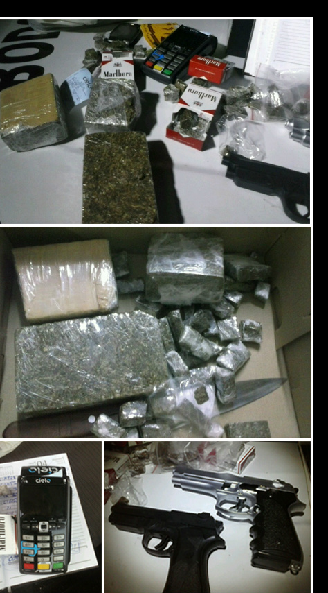 Durante vistoria foram encontradas carteiras de cigarros com a droga, as armas e a máquina. Em seguida, a equipe se deslocou até a casa de Carlos Henrique e no local encontraram mais um quilo de maconha, várias latas de spray e fotos que revelam que ele praticava pichações na cidade.