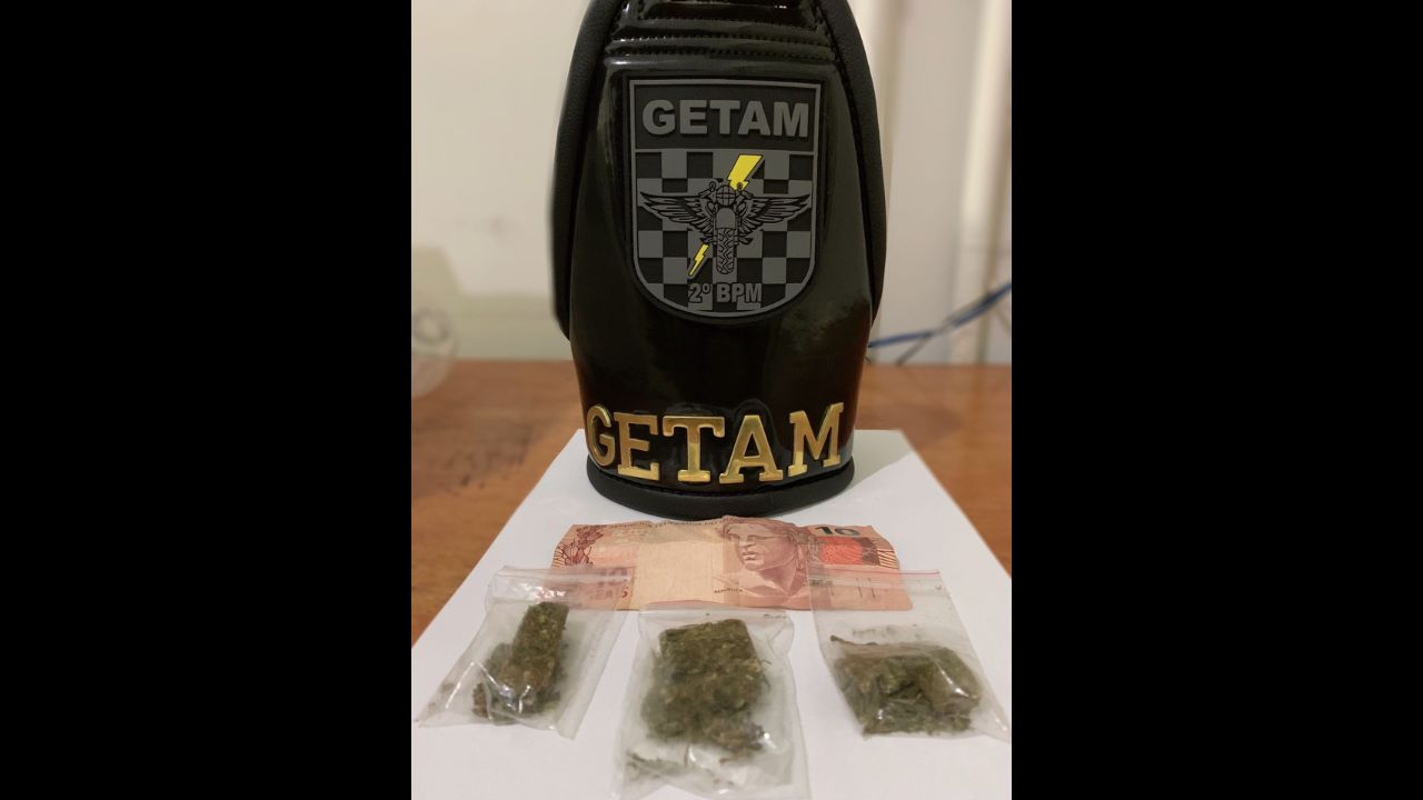 Na abordagem, foi encontrado pelos policiais no bolso dianteiro direito com um deles duas embalagens com porções de maconha prontas para o tráfico, pesando 7,40g, além de R$ 10 em dinheiro.