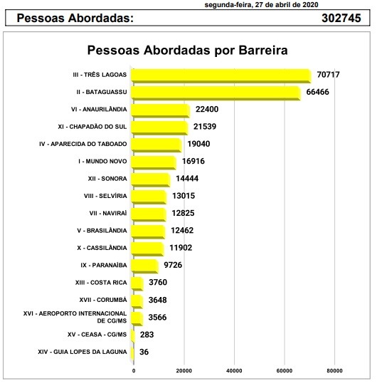 Segundo o boletim divulgado, na somatória de abordagens das 17 barreiras montadas em todo o Estado de MS, Três Lagoas (MS) continua como a primeira no ranking na quantidade de pessoas e veículos abordados