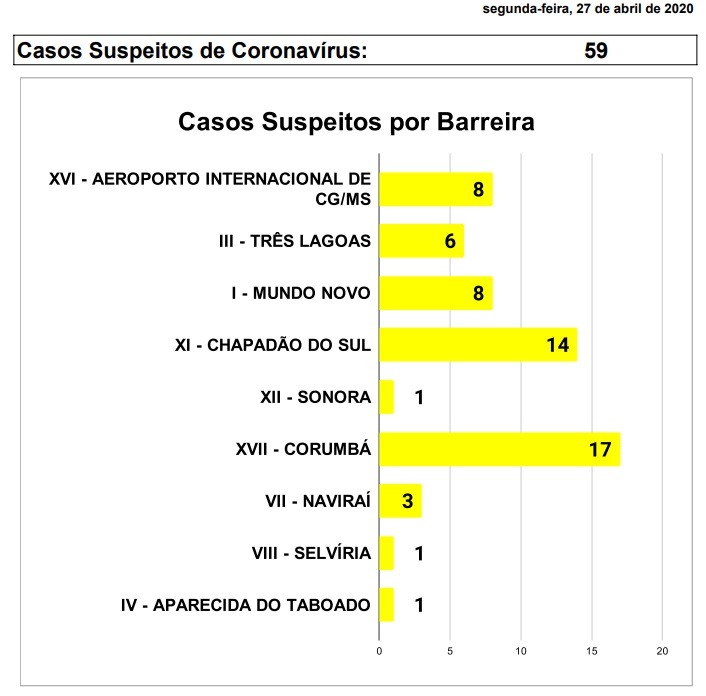 Segundo o boletim, até esta segunda, a Barreira Sanitária notificou como suspeitas para Covid-19 cerca de 59 pessoas, sendo: 17 casos suspeitos em Corumbá, 14 casos em Chapadão do Sul, 8 casos no Aeroporto Internacional de CG/MS, 8 casos em Mundo Novo, 6 casos em Três Lagoas, 3 em Naviraí e em Naviraí, Aparecida do Taboado e Selvíria um caso cada.
