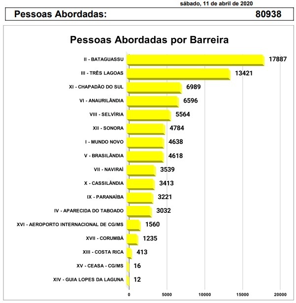 Segundo o boletim, na somatória de abordagem das 17 barreiras montadas em todo o Estado, já foram abordadas cerca de 80.938 pessoas. Dentre as cidades Três Lagoas (MS) é o segundo no ranking de pessoas e veículos abordados. No município, neste sábado (11), cerca de 5.946 meios de transporte foram abordados, dentre eles a maioria carro. Dentre as cidades, em primeiro lugar está Bataguassu com 17.887 pessoas abordadas em cerca de 8.644 meios de transporte.