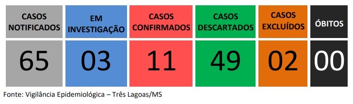 TRÊS LAGOAS (MS) – A Secretaria Municipal de Saúde (SMS), por meio da Vigilância Epidemiológica, divulgou, neste domingo (12), o mais recente Boletim Epidemiológico que traz mais dois novos casos confirmados para Covid-19 (Coronavírus). Com isso, Três Lagoas contabiliza um total de 11 casos positivos para a doença.