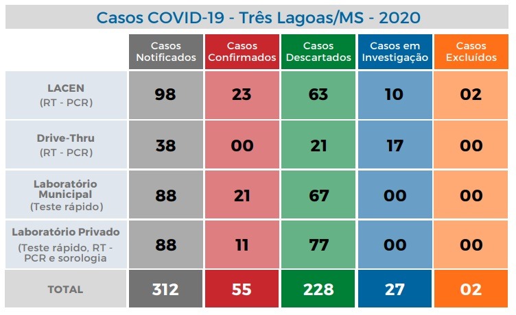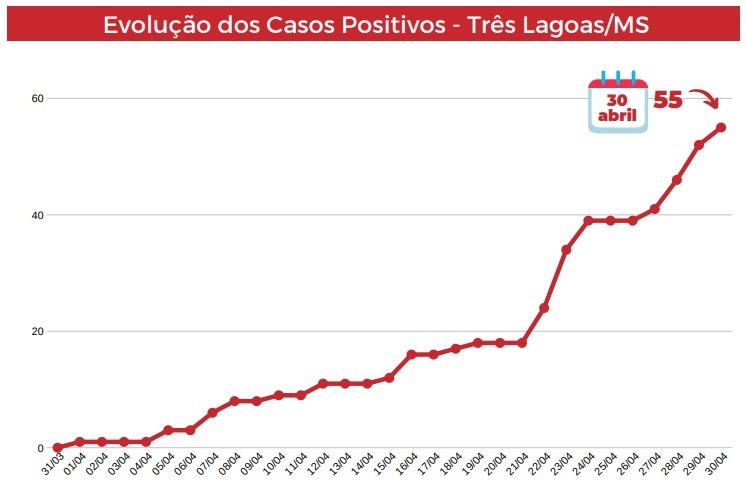 TRÊS LAGOAS (MS) – A Secretaria Municipal de Saúde (SMS), por meio do setor de Vigilância Epidemiológica, divulgou os dados do BOLETIM COVID-19 referente à esta quinta-feira (30). Foram confirmados mais três casos positivos, passando para 55 o total de pacientes com o novo coronavírus.