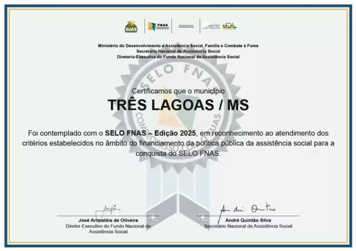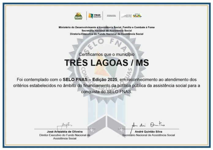 A Prefeitura de Três Lagoas foi reconhecida com o Selo FNAS de Excelência, certificação concedida pelo Fundo Nacional de Assistência Social a estados e municípios que se destacam na gestão orçamentária, financeira e contábil dos recursos do Sistema Único de Assistência Social (SUAS).