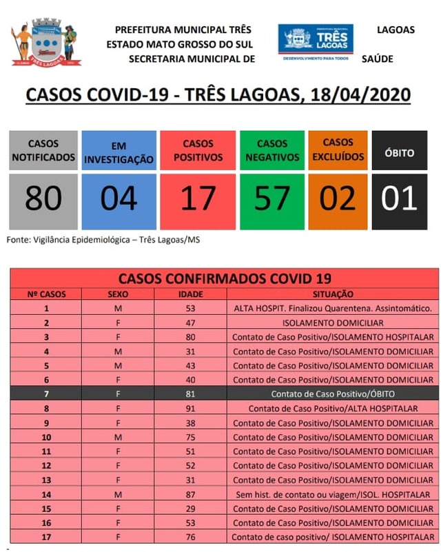 Os números de notificações e casos sendo investigados também subiram. Os casos notificados passaram de 76 para 80; destes, 04 estão em investigação. Os casos positivos chegaram a 17, já os casos negativos subiram de 56 para 57. Casos excluídos permaneceram em 02. Três Lagoas registra 01 óbito pela doença.