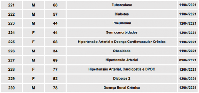 Hoje foi registrado 08 novos óbitos e confirmadas outras 05 mortes que eram suspeitas no boletim anterior, totalizando, assim, 13 mortes confirmadas no dia. Além disso, foram notificados 04 novos óbitos suspeitos, totalizando 06 casos que aguardam resultado de exame.