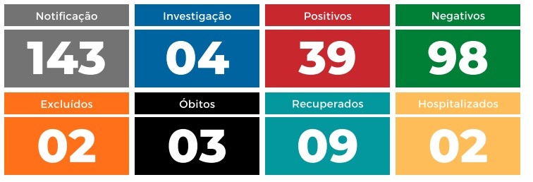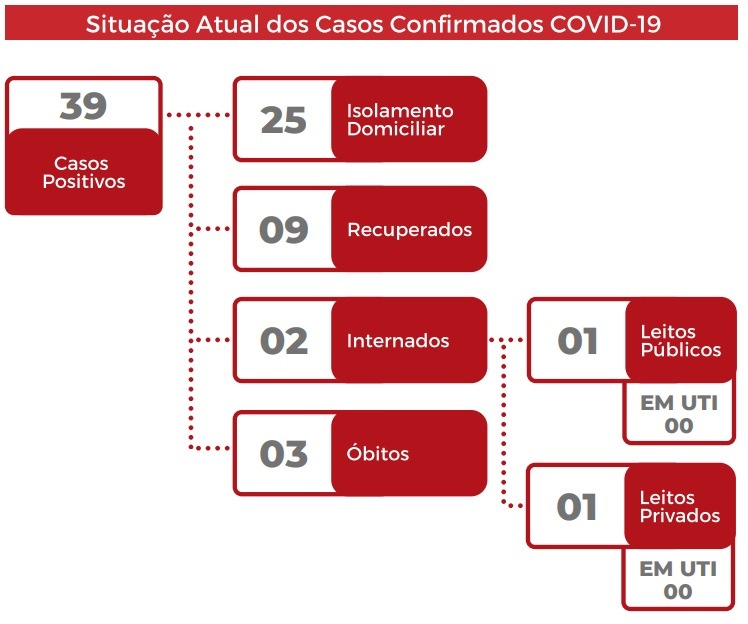 Dos 39 casos positivos no município, 25 estão em isolamento domiciliar, 09 estão recuperados, 3 foram a óbitos e dois continuam internados (um em leito particular e outro em leito público).