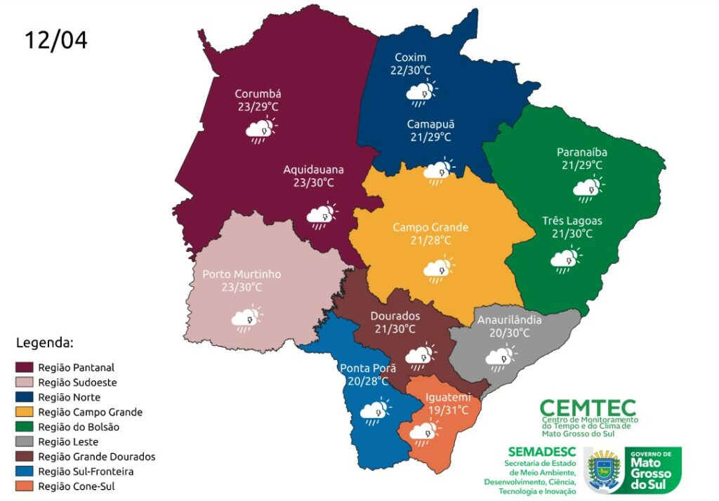 A mínima em Campo Grande será de 21°C e a máxima de 28°C. Em Dourados, mínima de 21ºC e máxima de 30°C. Ponta Porã terá mínima de 20°C e máxima de 28°C. Porto Murtinho registra 23°C de mínima e atinge 30°C de máxima.