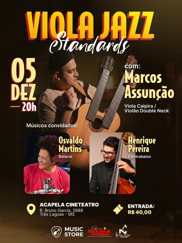 Três Lagoas recebe nesta sexta-feira (5), às 20h, no Acapela Cineteatro, o concerto “Viola Jazz Standards”, do Marcos Assunção Trio — uma formação que desafia fronteiras musicais ao inserir a viola caipira no universo do jazz contemporâneo.