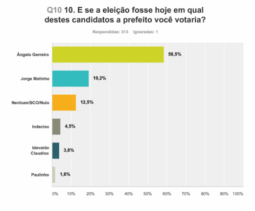 Os indecisos são 4,5%, enquanto os que votam em branco, anulam o voto ou preferem não votar em nenhum dos candidatos representam 12,5 % do eleitorado. O candidato Idevaldo Claudino, coligação A hora da mudança é agora, tem 3,8% das intenções de voto e o concorrente do PHS, Paulo Leite, aparece na pesquisa com 1,6% dos votos.