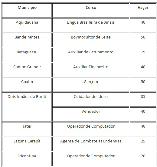 São nove opções de cursos, com duração média de três meses, distribuídos nos municípios de Aquidauana, Bandeirantes, Bataguassu, Campo Grande, Coxim, Dois Irmãos do Buriti, Jateí, Laguna Carapã e Vicentina.