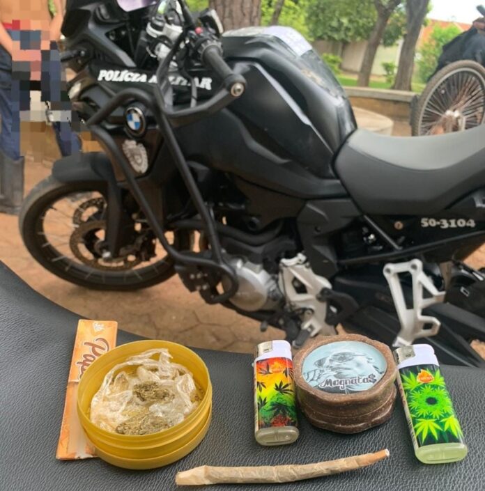 Com o abordado foi localizado um cigarro de maconha, pesando 1gr, e em um recipiente, a polícia localizou outros 2,8gr da mesma droga, além de papel seda e um dichavador. No momento da abordagem, o usuário não se importou com a presença de idosos, mulheres e crianças que estavam no local.