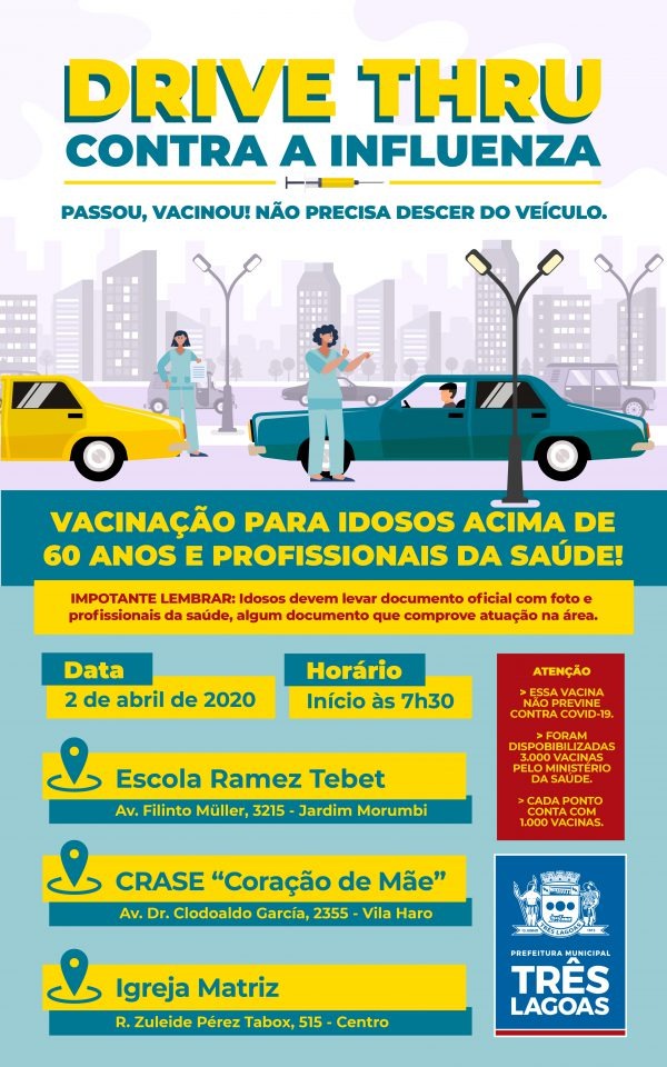 A medida é para evitar ao máximo aglomerações nos locais de vacinação, que inclusive, mudaram. Agora, apenas A Escola “Ramez Tebet”, Igreja Sagrado Coração de Jesus (Matriz) e Centro de Referência em Assistência Social e Educacional (Crase – “Coração de Mãe”) serão postos de vacinação, pois contam com local específico para entrada e saída de veículos.