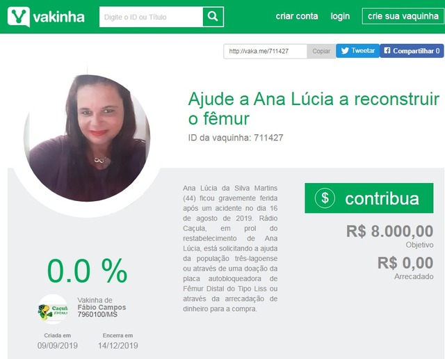 Rádio Caçula, em prol do restabelecimento de Ana Lúcia, está solicitando a ajuda da população três-lagoense ou através de uma doação da placa autobloqueadora de Fêmur Distal do Tipo Liss ou através da arrecadação de dinheiro para a compra.