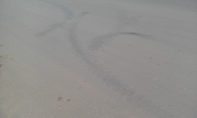 Marcas de frenagem no asfalto mostram movimentos circulares, que indicam que o condutor estivesse participando de um racha ou fazendo manobra de retorno com o carro em movimento, popularmente conhecida como cavalinho de pau.
