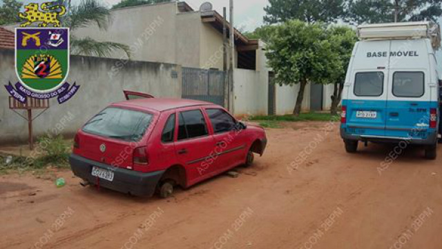 Sem duas rodas, bateria e alguns acessórios, um VW/Gol vermelho estacionado na Rua Manoel Custodio de Queiroz chamou a atenção dos moradores do bairro Jardim Alvorada, que nesta quarta-feira (26) informaram a Polícia Militar da situação suspeita.