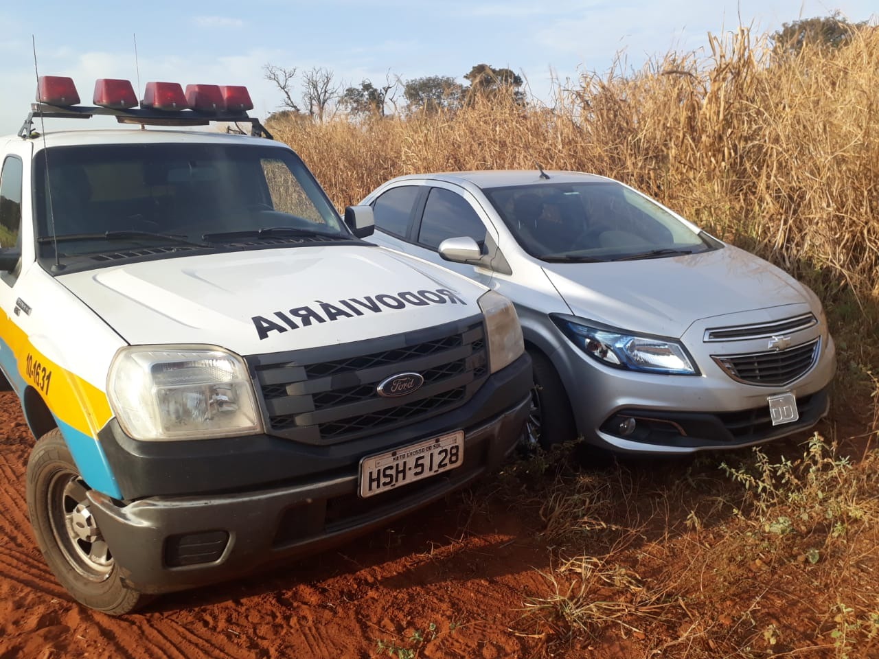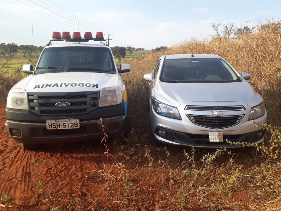 O Prisma com placas Campo Grande (MS) foi localizado abandonado com um rádio de comunicação em meio a vegetação e ainda apresentava sinais de adulteração, sendo confirmado via consulta que o veículo tem registro de furto e as placas originais são de Rio Claro (SP).