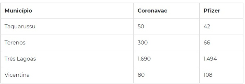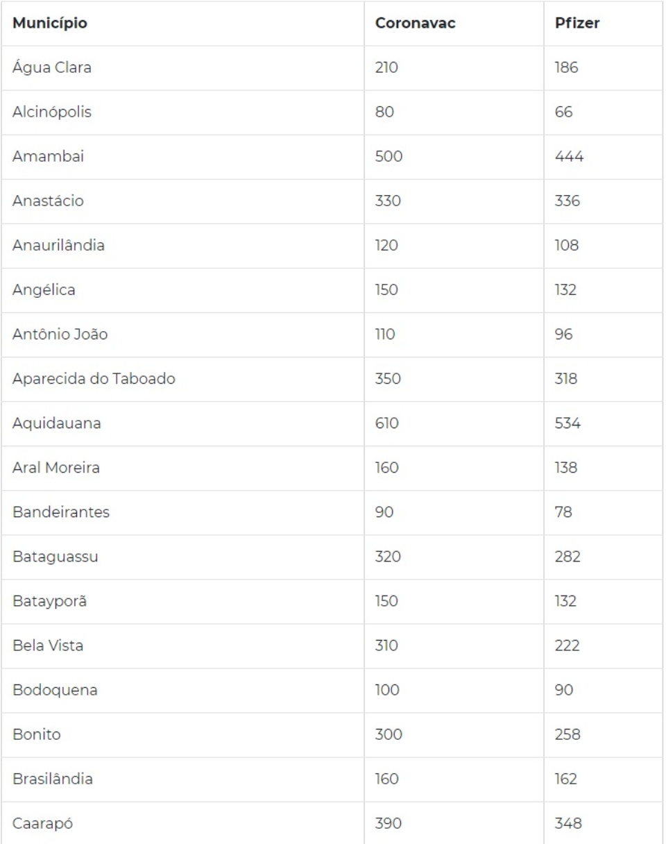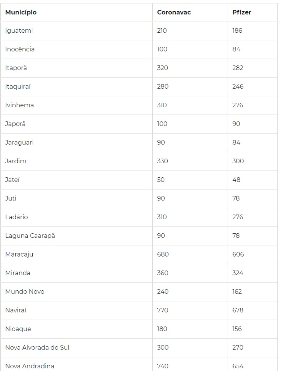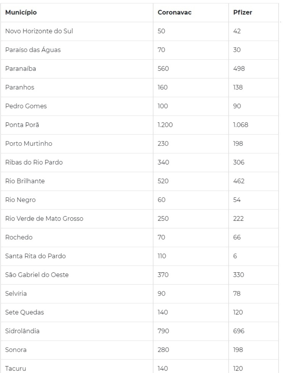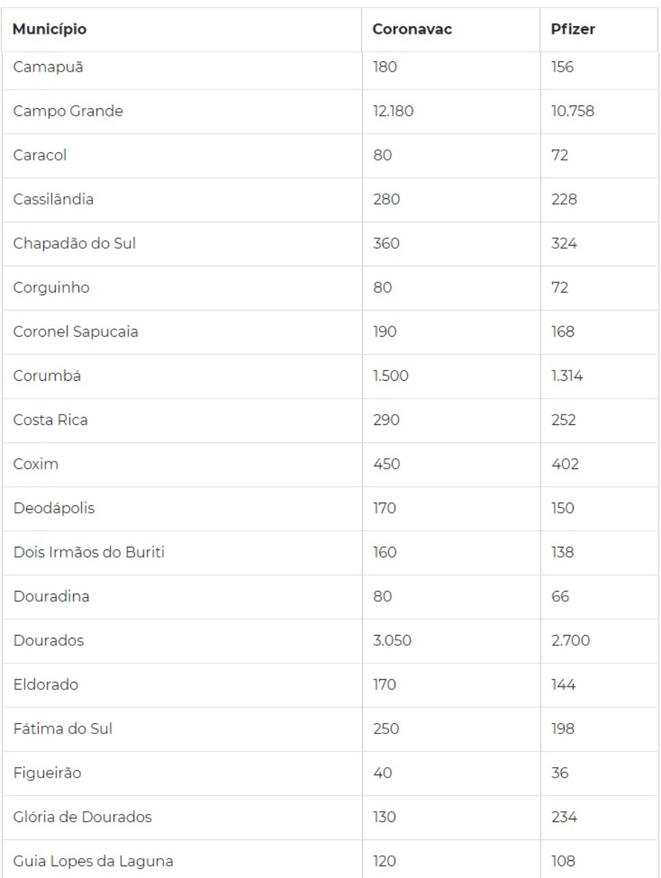 Figueirão, conforme a publicação, é a cidade que menos receberá vacinas da Coronavac – serão apenas 40 doses. Além disso, Santa Rita do Pardo terá apenas seis doses da Pfizer, ainda que receberá 110 da Coronavac.