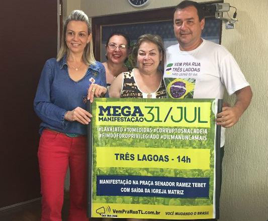 No ultimo sábado (23) a organização realizou uma carreata pelas principais ruas e avenidas de Três Lagoas, convidando à população três-lagoense para saírem às ruas e mostrares a força do povo brasileiro no combate à corrupção.