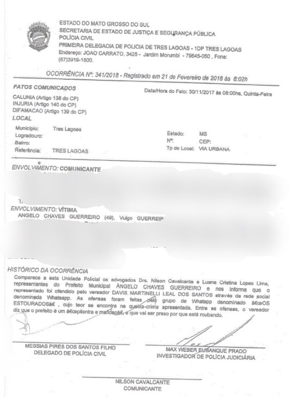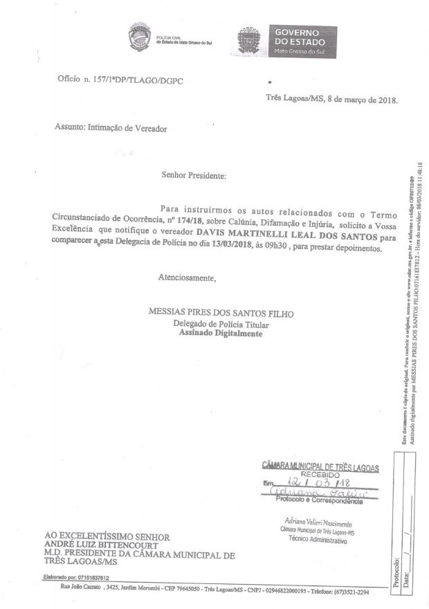 O Vereador Davis Martineli está sendo investigado pela Polícia Civil de Três Lagoas, acusado de ter cometido o crime de calunia, injuria e difamação contra o prefeito Angelo Guerreiro.
