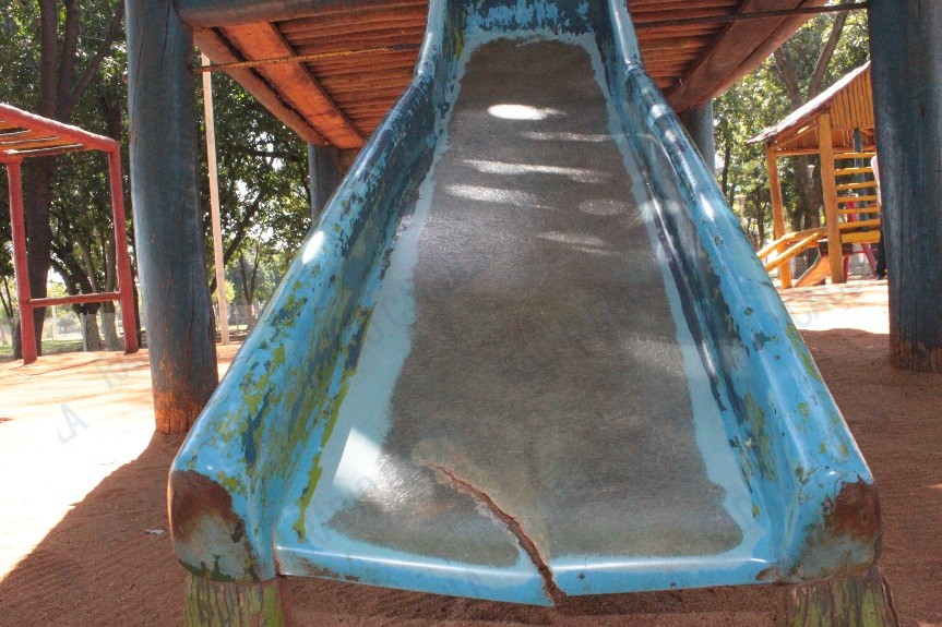 Vários brinquedos do parquinho estão quebrados, precisando de reparos