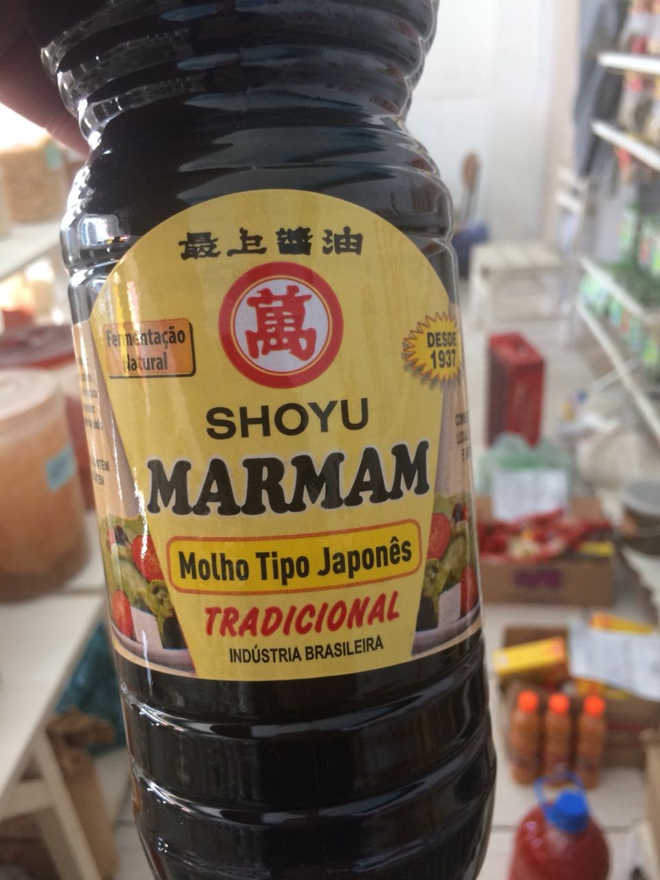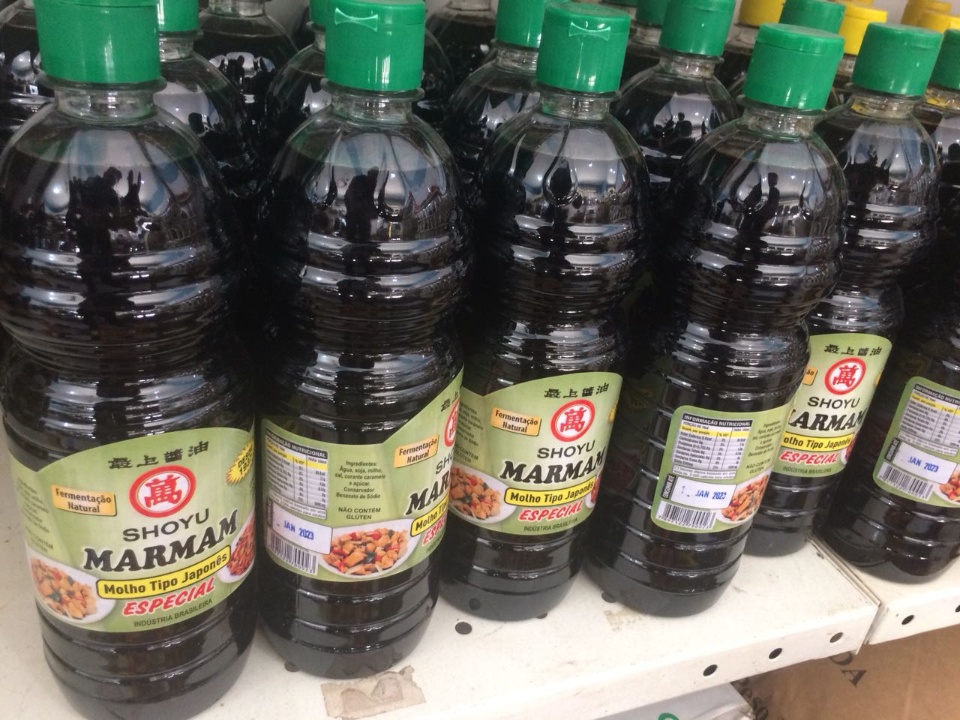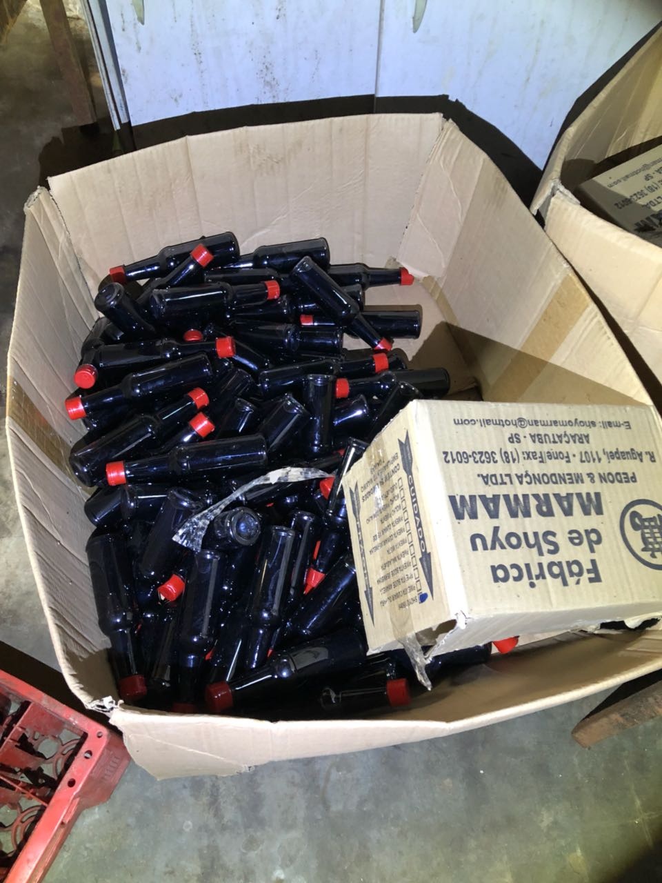 Aparentemente esse galão era utilizado para abastecer os frascos que são distribuídos para os estabelecimentos comerciais. Havia ainda uma grande quantidade de shoyo dentro de um tambor, que estava destampado, e embalagens vazias e etiquetas para identificar o produto.