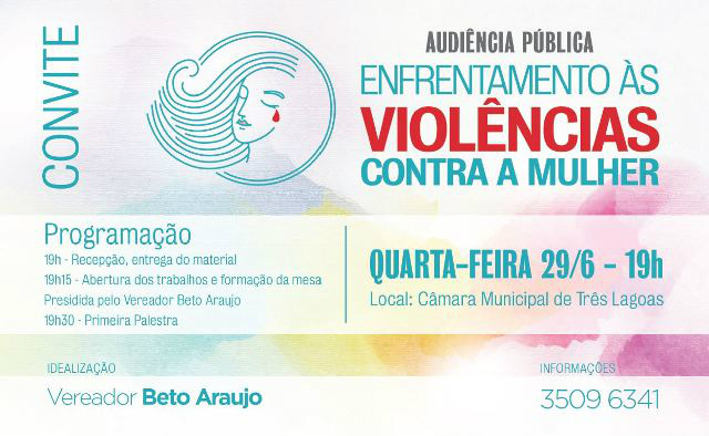 Nesta quarta-feira (29) será realizada a audiência publica, idealizada pelo vereador Beto Araujo, que tem como tema o enfrentamento às violências contra a mulher e acontece no auditório da câmara municipal de Três Lagoas.