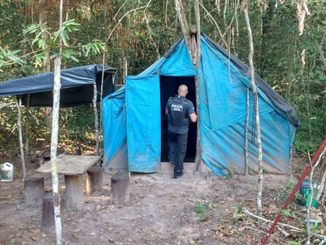Perto dos acampamentos que foram montados os policiais encontraram 32 montes de toras cortadas.