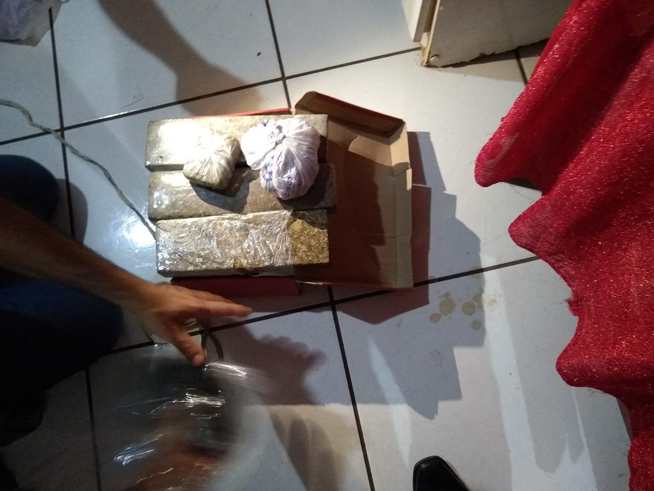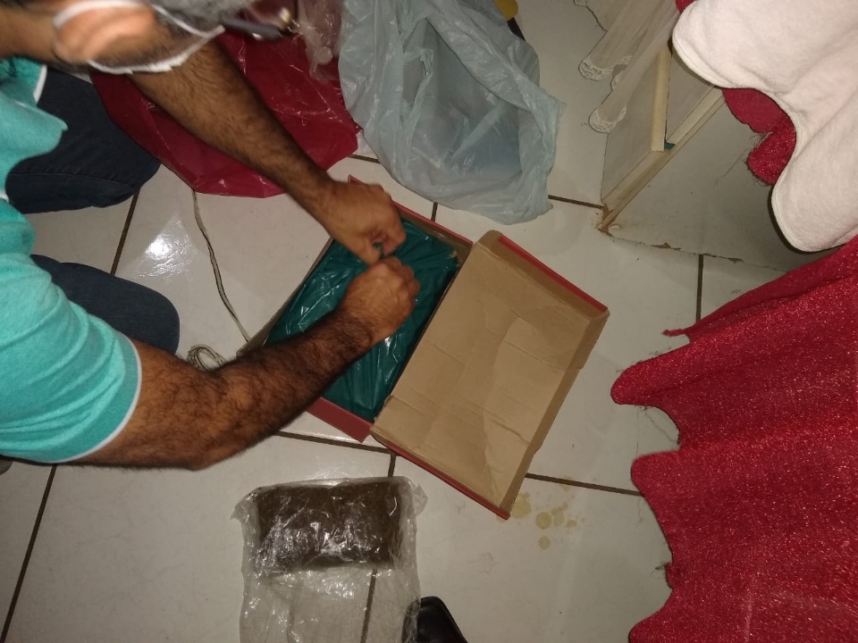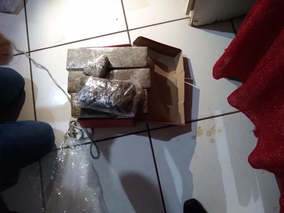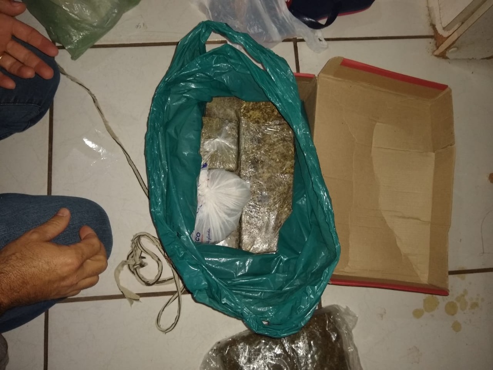 Os investigadores diligenciaram até a casa da suspeita, na Rua Visconde Tamandaré, no bairro Vila Nova e em buscas no imóvel, localizaram em uma caixa de sapatos escondido no meio de algumas roupas, cinco tabletes de maconha e Skank, que juntas pesaram quase 3,3 quilos.