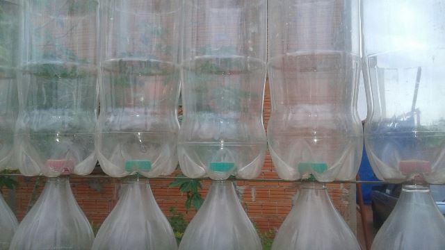 Foram utilizadas somente garrafas transparentes para combinar com o ambiente cercado de natureza