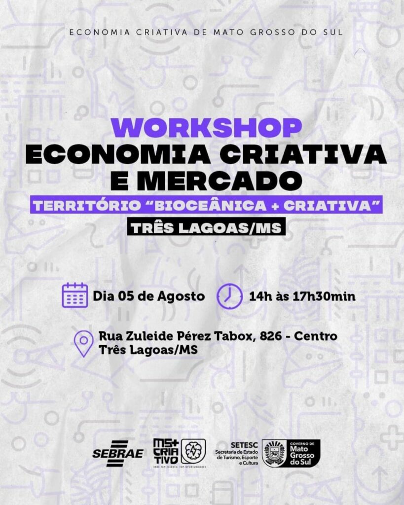Três Lagoas sedia, nesta terça-feira, 5 de agosto, o Workshop Economia Criativa e Mercado, uma iniciativa que integra o território “Bioceânica + Criativa”, dentro do programa de Economia Criativa de Mato Grosso do Sul. O evento será realizado das 14h às 17h30, na Rua Zuleide Pérez Tabox, 826 – Centro.